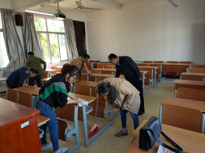 根据主题党日活动安排,支部党员对横江校区全部职工教室、自修室进行了彻底的卫生保洁。活动过程中,支部全体党员同志积极参与,不怕脏、不怕累,合理分工,互助协作,全面扫除地面垃圾,彻底清理卫生死角,细心擦去桌椅灰尘,然后把桌椅摆放整齐,再全方位喷洒消毒液。在全体党员的共同努力下,职工教室、自修室面貌焕然一新。通过本次主题党日活动,全体党员强化了责任担当意识,践行了奉献服务精神,有效推进了文明创建活动深入开展,有助于做实做好疫情防控工作,为员工返校创设一个整洁卫生、安全放心的学习、工作环境。
