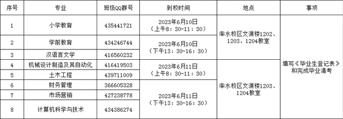 根据公司教学管理及毕业审核事项安排,定于2023年6月10日-6月11日安排成教学员到校填写《毕业登记表》(此表存入本人学籍学历档案,请务必重视,本人到校据实填写)和完成毕业清考事项。《毕业登记表》所有毕业生均需填写,另部分学员需同时完成毕业清考,清考名单及具体安排见教学管理QQ群(群号2022年9月已对外发布,http:/6f/e3/c525a159715/page.htm )通知。填写《毕业生登记表》及毕业清考是毕业审核重要环节,请务必按通知要求到校完成。具体安排如下: